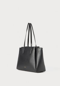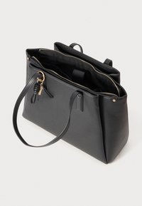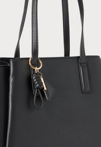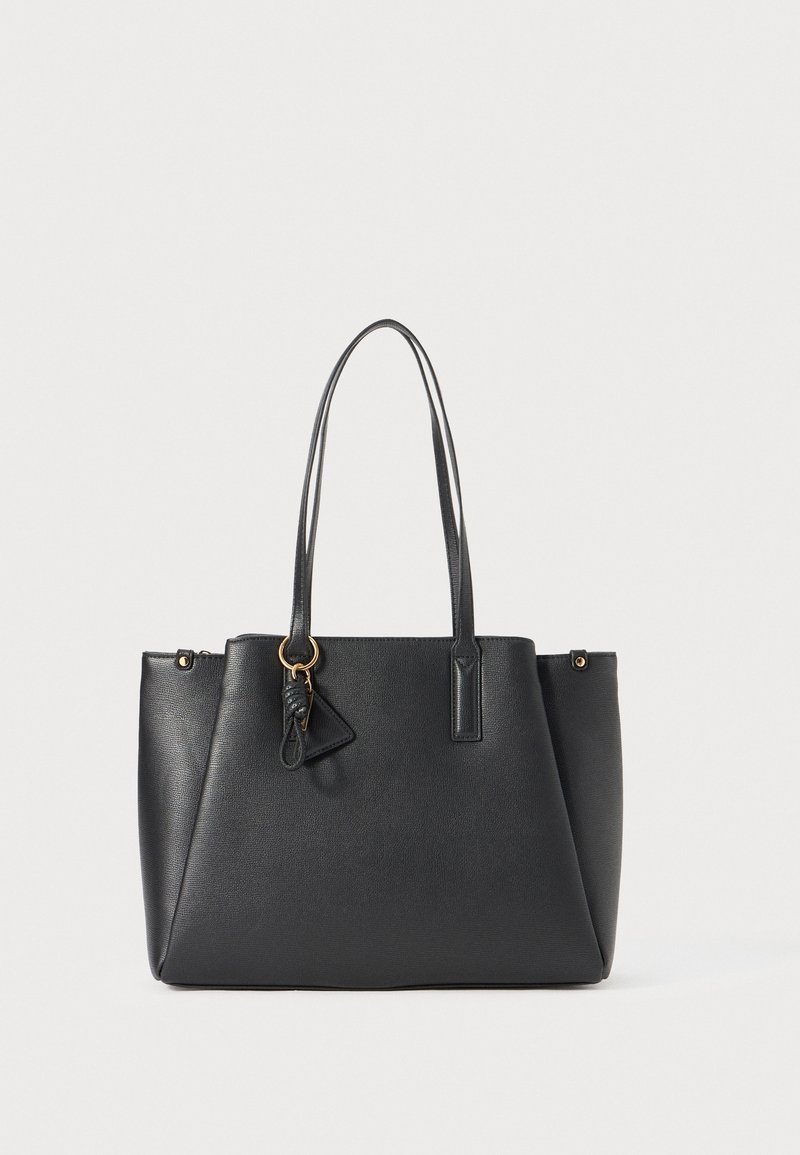 Sac cabas en cuir noir avec deux longues anses et un petit porte-clés triangulaire attaché, sur un fond clair uni.