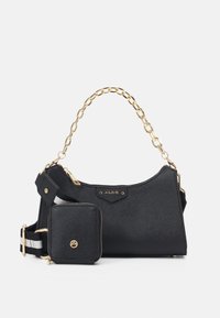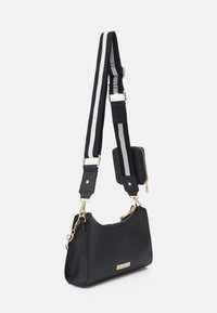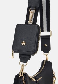 Sac à main noir texturé avec poignée chaîne dorée, petite pochette amovible avec fermeture éclair, et sangle rayée noire et blanche ajustable.