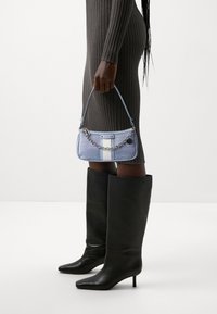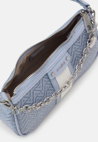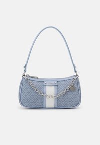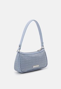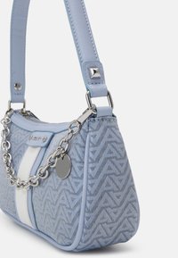 Sac à épaule bleu clair avec motif répétitif embossé en forme de "A", fermeture éclair argentée et plaque de marque métallique à l'avant.