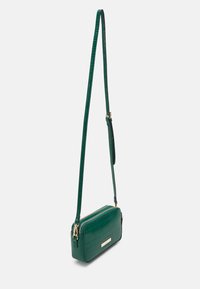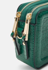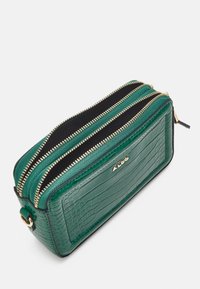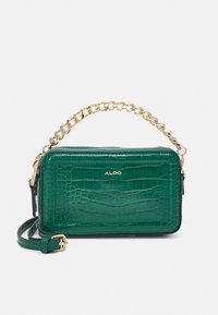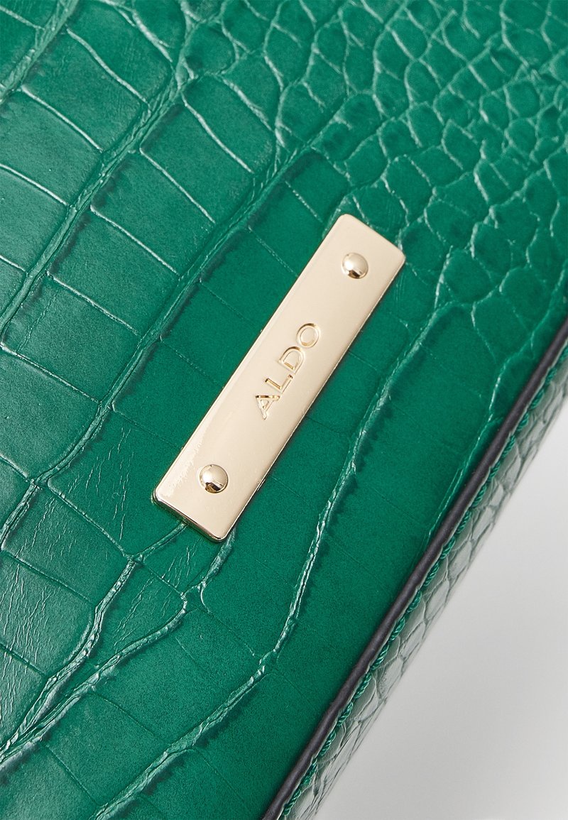Section de sac en cuir synthétique vert effet crocodile avec plaque rectangulaire dorée de la marque ALDO fixée par deux vis.