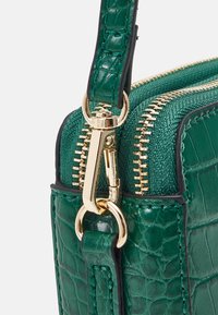 Sac à bandoulière en cuir embossé crocodile vert foncé avec une fine sangle et une fermeture éclair dorée sur un fond uni.