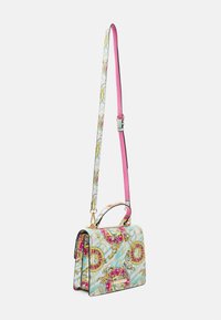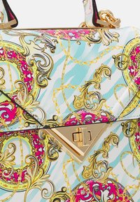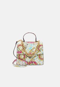 Sac carré avec motif baroque coloré, poignée chaîne dorée, poignée supérieure et bandoulière amovible assortie sur fond blanc.