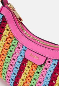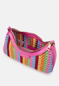 Petit sac à main rose avec bandoulière tressée et panneau avant en crochet multicolore présentant des rayures verticales en bleu, rouge, orange, vert et jaune.