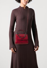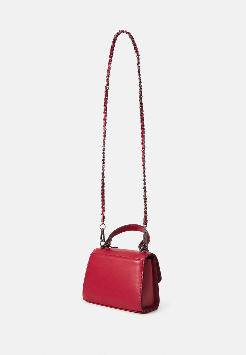 Sac à main en cuir rouge à la forme structurée, doté d'une bandoulière chaîne décorative et d'une poignée supérieure pour plus de polyvalence. Texture lisse et design minimaliste.