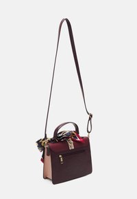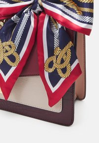 Sac à main en cuir structuré bordeaux et beige avec fermoir doré, poignée supérieure, bandoulière amovible, et foulard bleu marine avec motifs de cordes rouges et dorées attaché à la poignée.