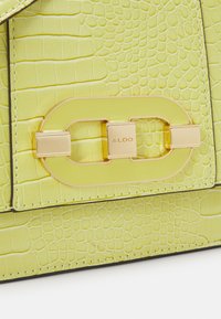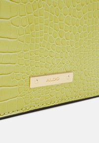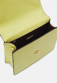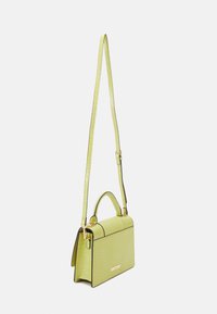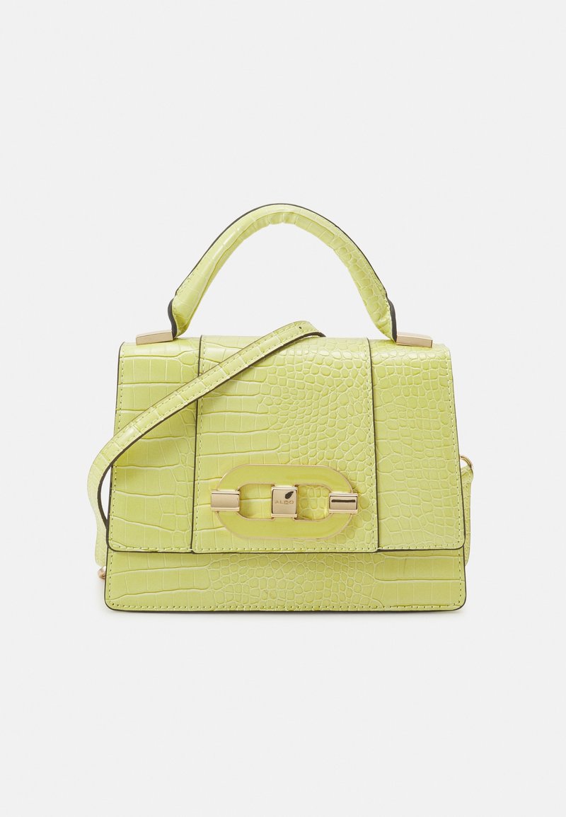 Sac à main en cuir vert clair embossé façon croco, avec poignée supérieure, bandoulière et fermoir rectangulaire doré sur le rabat avant.