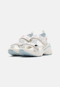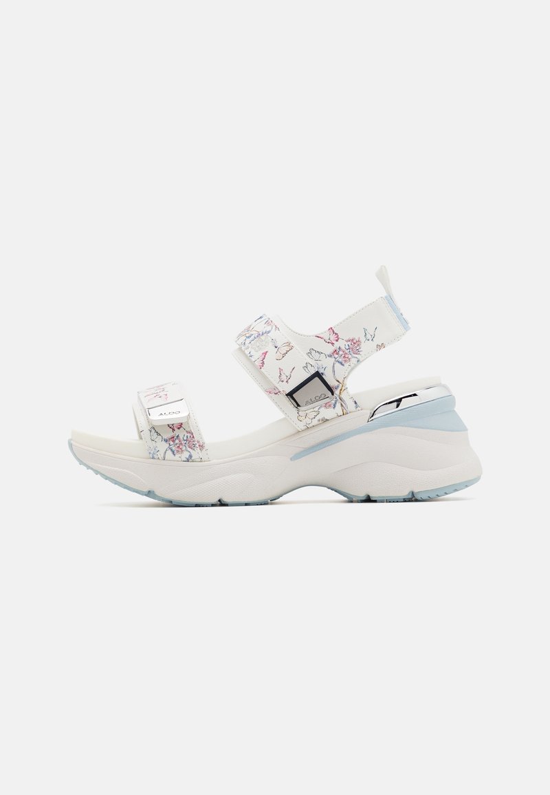 Sandales à plateforme blanches avec motif floral, lanières ajustables, accents argentés et détails bleu clair sur la semelle épaisse.