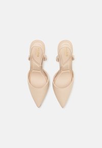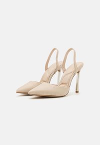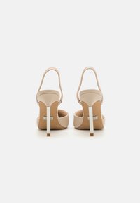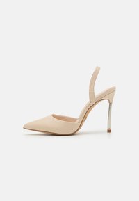 Escarpins slingbacks beige à bouts pointus avec une texture lisse, talon stiletto fin argenté, et un design minimaliste. Côtés ouverts et avant découpé bas.