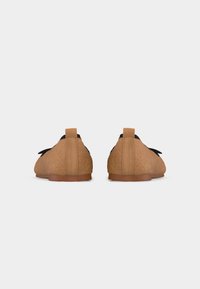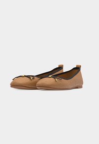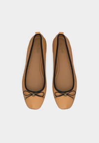 Ballerine beige avec motif floral texturé, bordure noire et petit nœud, flottant au-dessus de l'asphalte près d'un mur carrelé.