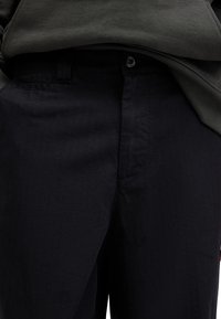 Pantalon en coton bleu marine avec une coupe droite, doté de deux poches avant, de coutures intérieures et d'une fermeture à bouton. Porté avec des baskets blanches.