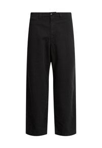 Pantalons cargo noirs avec plusieurs poches, une coupe décontractée et un tissu durable. Comprend une fermeture à bouton et des détails en zip.