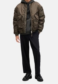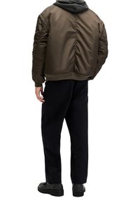 Homme portant une veste bomber marron foncé, un sweat à capuche noir, un pantalon ample noir et des chaussures à lacets noires épaisses sur un fond clair uni.