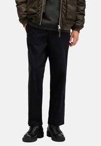 Pantalon noir en tissu lisse, avec une coupe droite, des poches latérales, et associé à des chaussures noires brillantes.