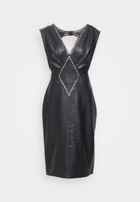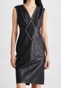 Robe en cuir noir sans manches avec décolleté en V plongeant et panneau clouté en forme de losange à la taille, portée par une personne se tenant debout avec de longs cheveux noirs.