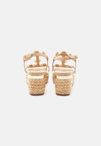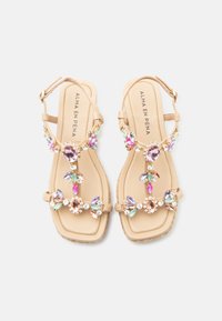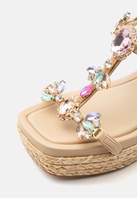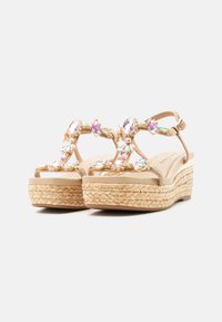 Sandale compensée beige avec plateforme espadrille tressée, bride en T ornée de pierres colorées et boucle réglable à la cheville.