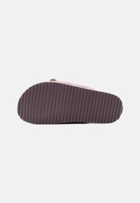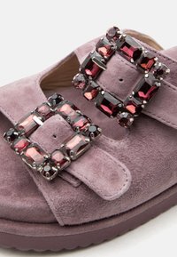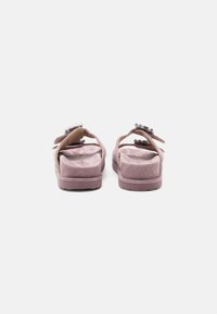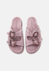 Sandale mule en daim rose avec deux brides à boucles ornées de bijoux et une semelle en caoutchouc texturée, vue de profil sur fond blanc.