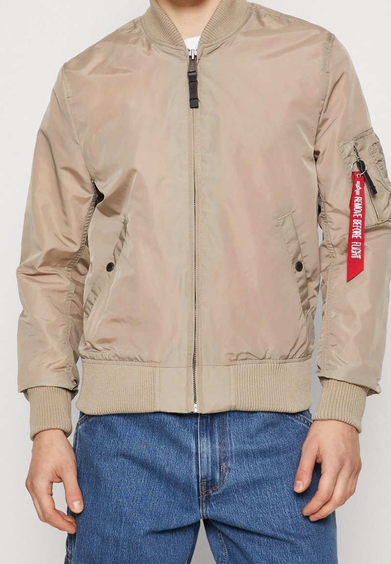 Veste bomber beige avec poignets et ourlet côtelés, fermeture éclair frontale, poches latérales, et une étiquette rouge "Remove Before Flight" sur la poche de la manche gauche.