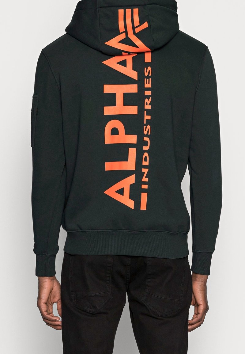 Sweat à capuche noir avec un grand logo orange "ALPHA INDUSTRIES" disposé verticalement dans le dos. Il est doté d'une capuche avec cordon de serrage et de poignets côtelés.