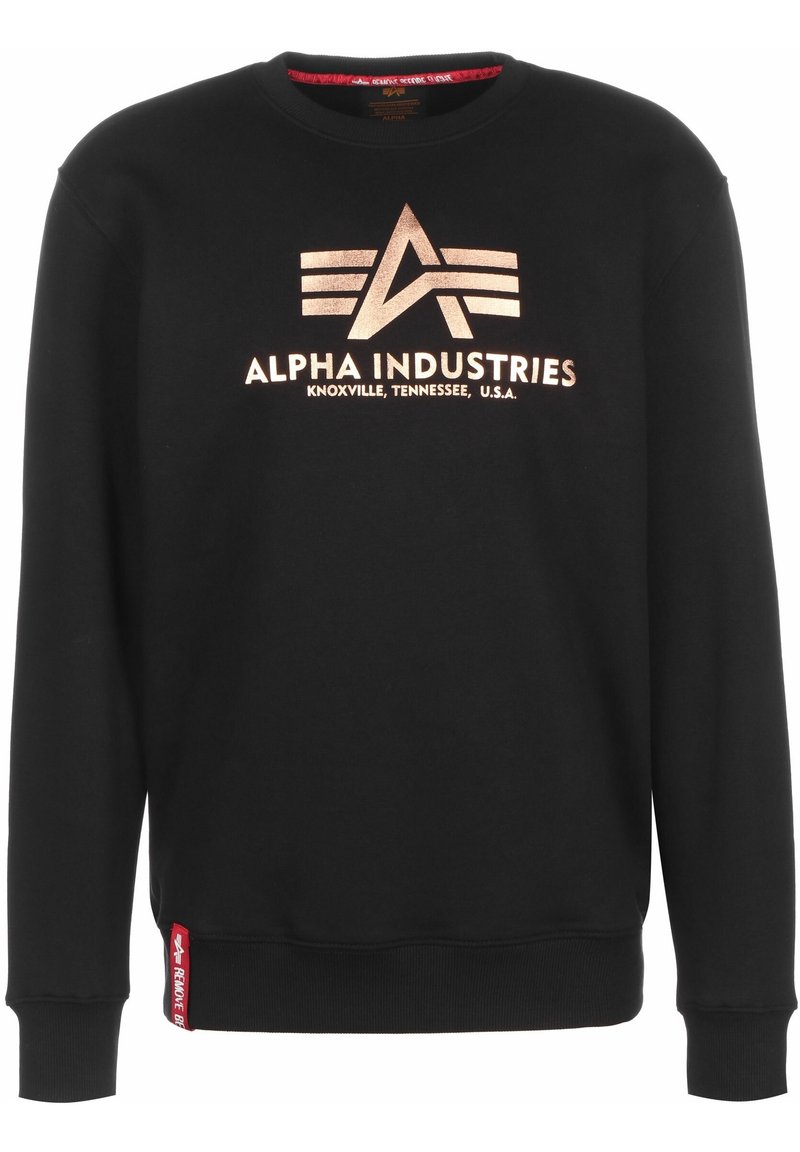 Sweat-shirt noir en coton, avec un logo métallique doré "ALPHA INDUSTRIES" orné d'un design triangulaire, et une étiquette rouge sur l'ourlet.