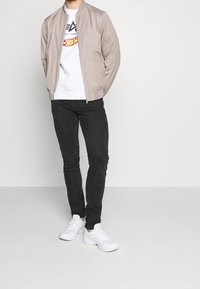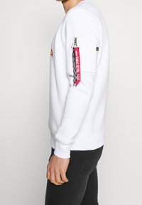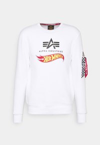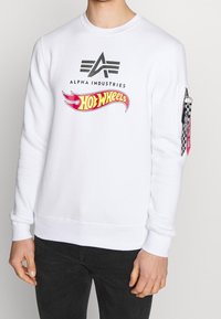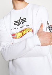 Homme portant un sweat-shirt blanc Alpha Industries avec le logo Hot Wheels et un pantalon noir, debout devant un fond clair uni.