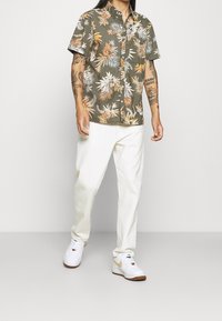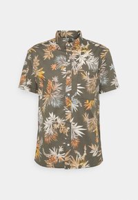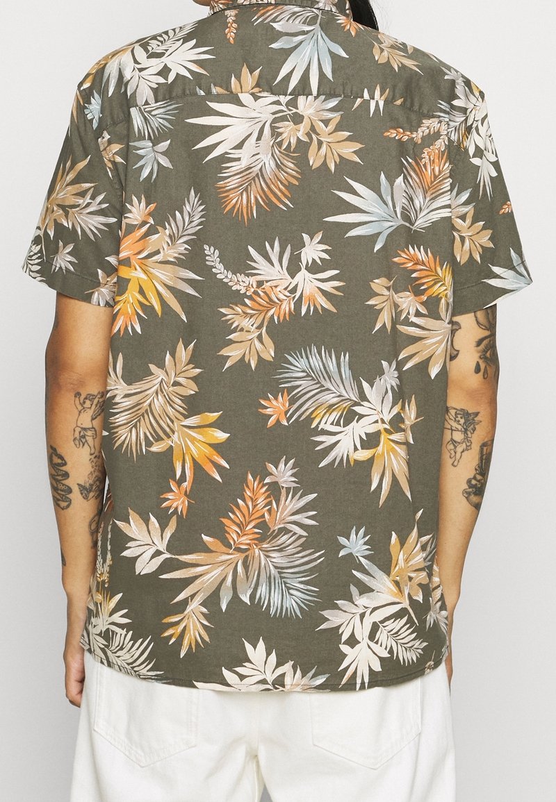 Chemise manches courtes vert olive avec un motif de feuilles tropicales vibrant aux teintes pastel, confectionnée dans un tissu léger avec une coupe décontractée.