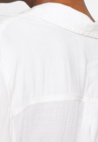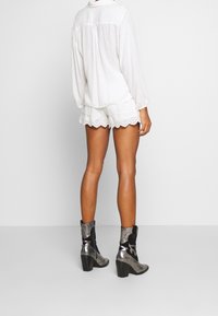 Femme portant une chemise blanche à manches longues boutonnée et un short blanc avec un ourlet festonné ajouré, les mains dans les poches, debout devant un fond uni.