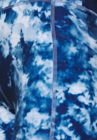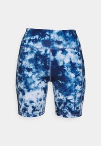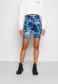 Shorts de vélo en tissu extensible à motif tie-dye bleu, avec une taille haute et une coupe ajustée. Portés avec un sweat à capuche court blanc et des bottes noires.
