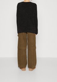 Personne portant un pull noir à manches longues en tissu duveteux et un pantalon vert olive, debout devant un fond clair uni.