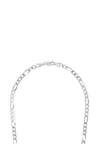 Collier chaîne Figaro argent porté par une personne à la peau claire et aux cheveux blonds, associé à un haut noir à col en V.