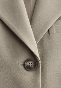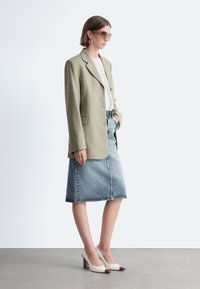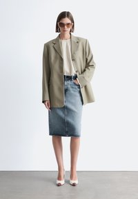 Femme portant un blazer kaki surdimensionné, un haut rayé blanc, une jupe en jean, de grandes boucles d'oreilles anneaux, et de grandes lunettes de soleil marron sur un fond uni.
