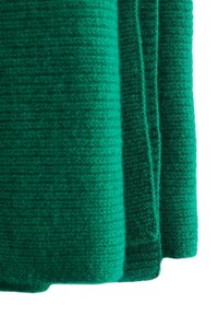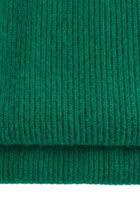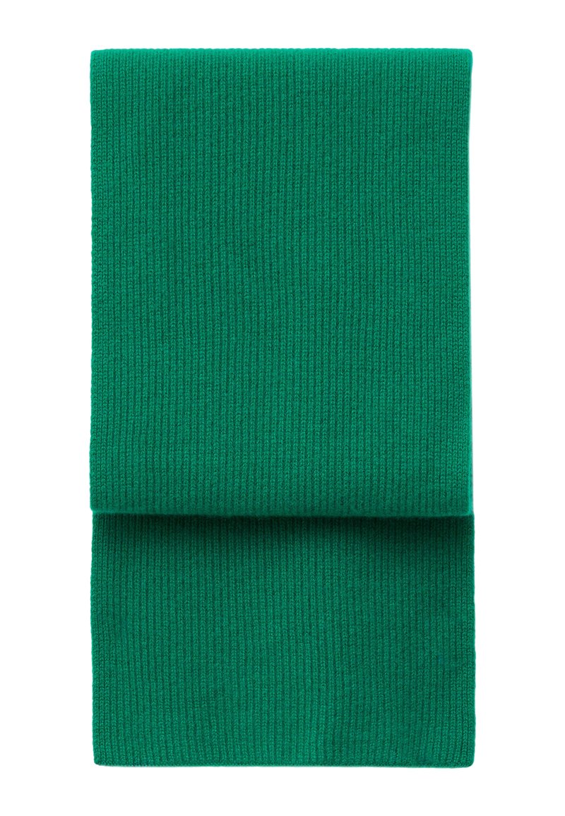 Écharpe en tricot verte, texture côtelée, pliée en deux, forme rectangulaire, matériau doux, sans motifs ni détails matériels visibles.