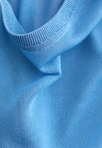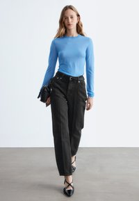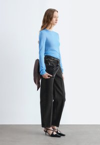 Jeune femme portant un haut à manches longues bleu clair et un pantalon noir, tenant un sac à main noir avec un foulard à motifs, debout devant un fond uni.
