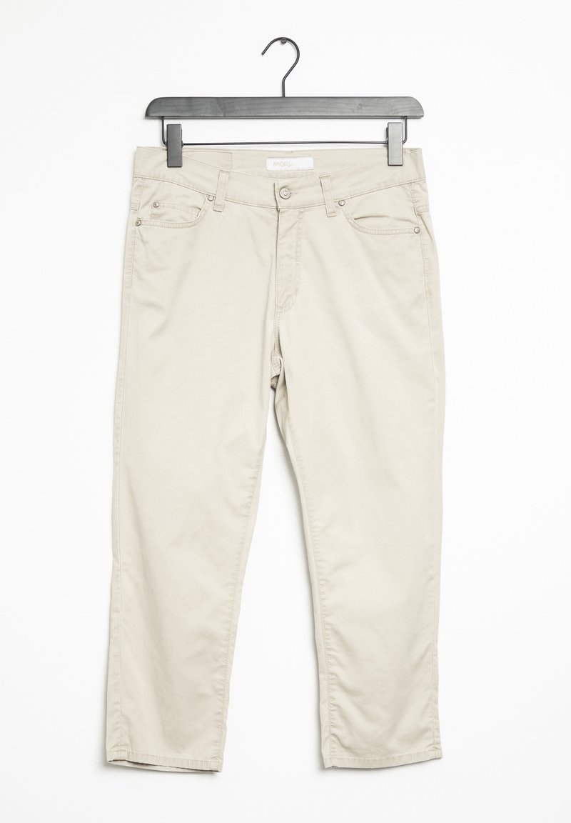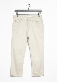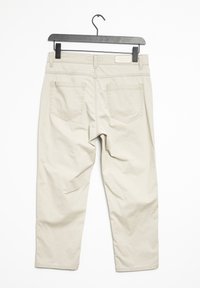 Chinos en coton beige à coupe droite, avec poches avant et arrière, et une fermeture à bouton. Suspendus à un cintre en plastique noir.