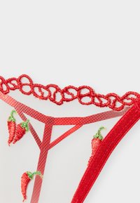String rouge transparent avec des piments rouges brodés et des fines bretelles reliées par de petits anneaux métalliques sur fond blanc.