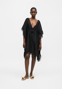 Femme portant une robe noire ample avec des franges aux manches et à l'ourlet, un décolleté en V profond avec un lien à franges, debout dans des sandales neutres sur fond blanc.