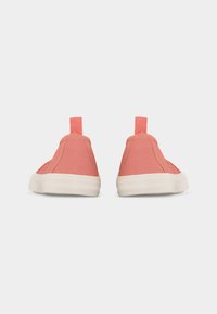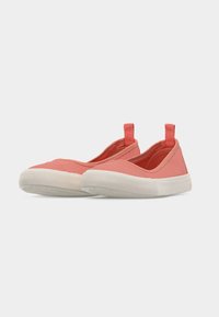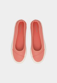 Une chaussure en toile rose unique à enfiler avec une semelle en caoutchouc blanche flottant au-dessus d'un banc en bois en plein air avec des plantes vertes en arrière-plan.