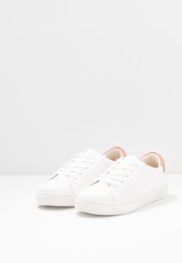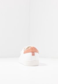 Jambes portant des baskets blanches avec des accents rose clair au talon, posées sur un sol blanc devant un fond blanc uni.