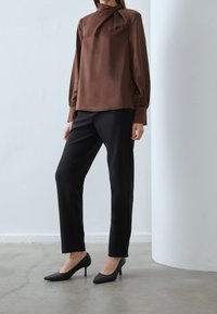 Personne portant un chemisier en satin marron à manches longues avec un col drapé et un pantalon noir, les mains ajustant l'ourlet du chemisier.