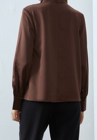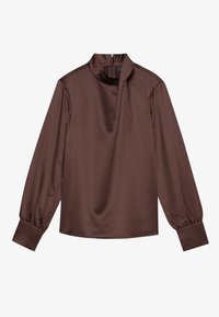 Blouse en satin marron à manches longues, décolleté rond et design à nouer à l'avant. Sa texture lisse et son éclat subtil rehaussent son apparence.
