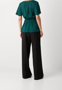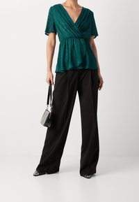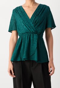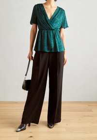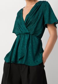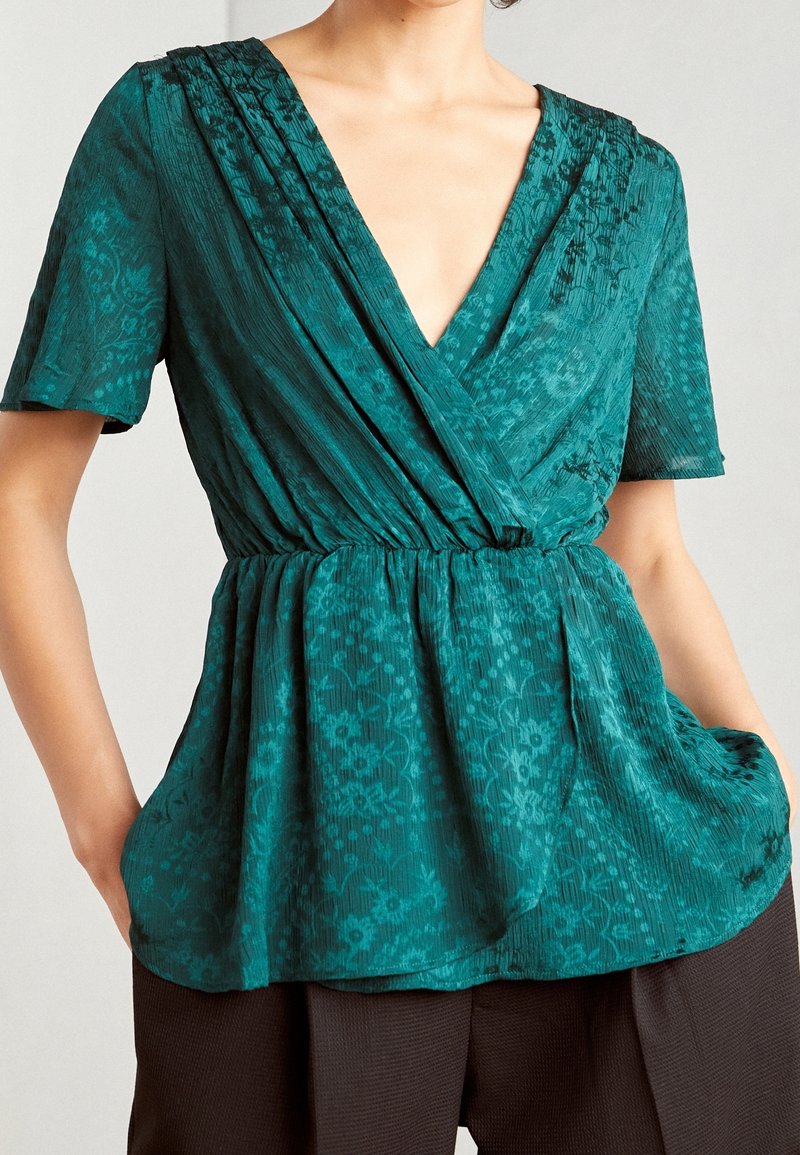 Blouse cache-cœur bleu sarcelle avec motif floral subtil, manches courtes, taille froncée, associée à un pantalon marron foncé, mains dans les poches.