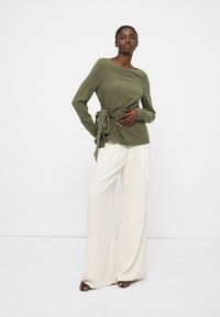 Femme portant un haut manches longues vert olive avec un détail de lien sur le côté et un pantalon blanc à jambes larges, debout devant un fond blanc uni.
