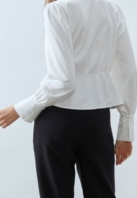 Blouse blanche à manches longues, portefeuille, avec un col en V, des épaules froncées et des poignets élastiques, associée à un pantalon bleu marine. Texture de tissu lisse.