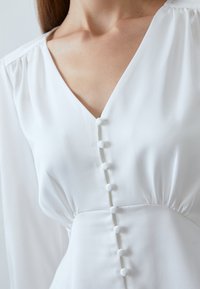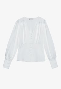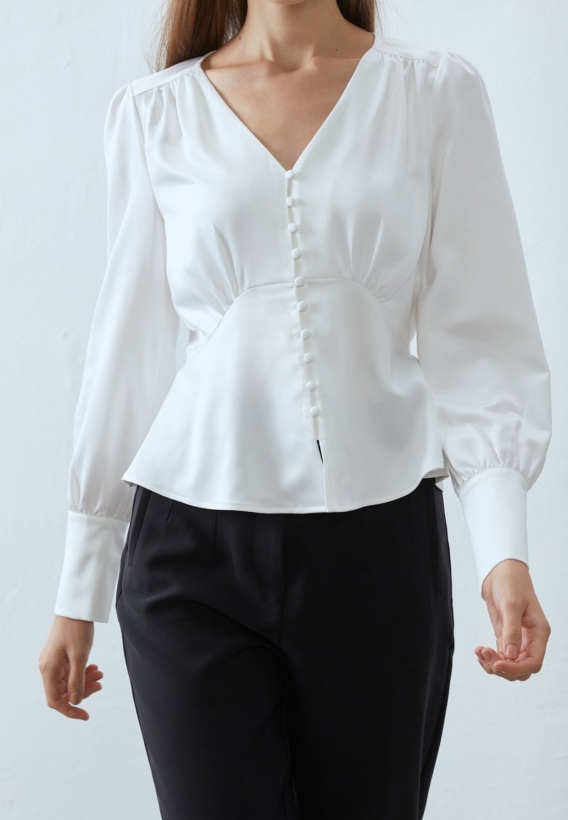 Blouse blanche à manches longues avec un décolleté en V et fermeture à boutons sur le devant, fabriquée en tissu lisse, dotée d'une taille cintrée et d'épaules froncées.