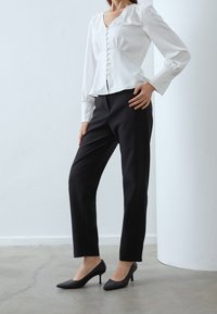 Femme portant une chemise blanche à manches longues avec des boutons-pression latéraux et un pantalon noir, vue du cou aux hanches.