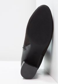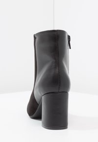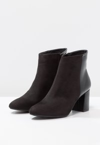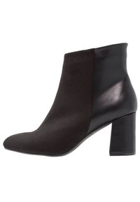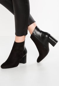 Bottines noires en mélange de daim et de cuir, bout pointu, talon bloc, et détail de fermeture éclair latérale ; associées à un pantalon noir ajusté.