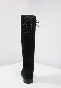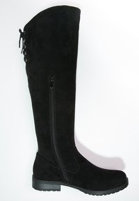 Botte noire en daim montant jusqu'au genou, avec un bout arrondi, une semelle plate et un détail de laçage décoratif à l'arrière. Texture lisse et design simple.