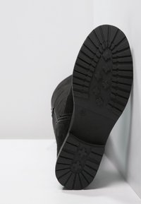 Bottes cuissardes en daim noir avec talons carrés et semelles crantées, dotées de lacets à l'arrière et d'une coupe légèrement froissée sur les jambes.