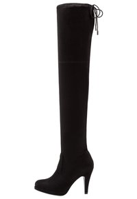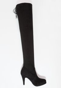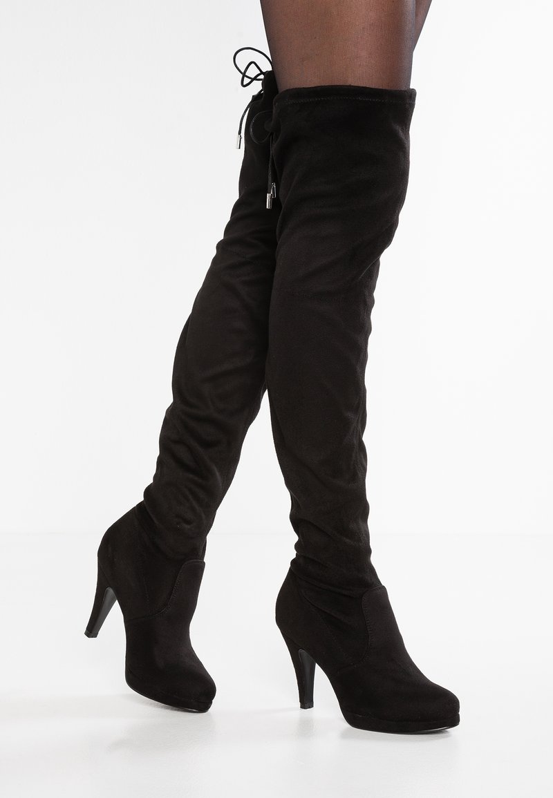 Bottes noires montantes au-dessus du genou en daim, dotées d'un talon épais, d'une coupe ajustée et d'un détail noué en haut. Texture lisse.