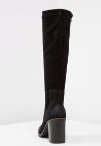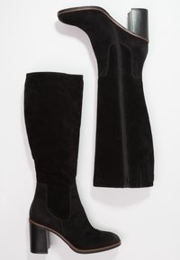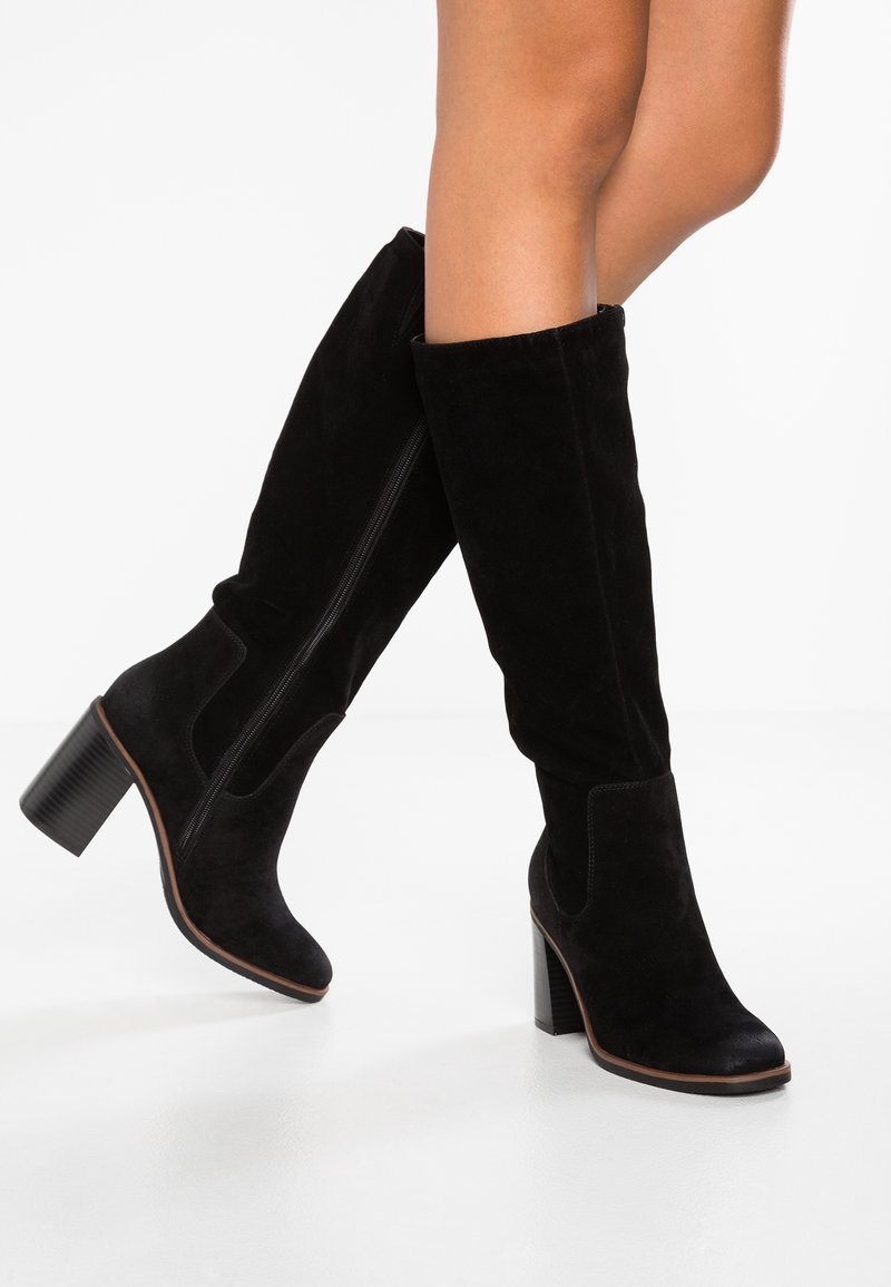 Bottes noires en daim jusqu'au genou avec des talons carrés, portées sur des jambes croisées sur un fond blanc uni.