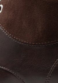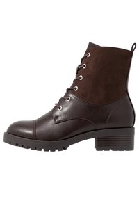 Bottes courtes en cuir et daim marron avec des lacets à l'avant, des œillets argentés et une semelle en caoutchouc texturée. Design décontracté avec une fermeture éclair latérale.